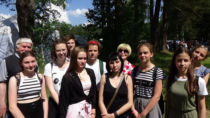 Гуляя с ребятами среди пёстрой шумной публики, мы встретили Валентина Яковлевича с супругой. Они приехали посмотреть на театрализованные действа, подобным которым раньше там не бывало. Мы, конечно, обрадовались такой встрече. Валентин Яковлевич тоже был рад пообщаться с молодёжью. Узнав, с какой целью они приехали, он искренне восхитился, напутствовал ребят навсегда запомнить этот день. Ребята пригласили именитого писателя сфотографироваться с ними. Я предложила ему стать в центр группы. Но он с искренним простодушием воскликнул: – Нет, нет, я сбоку: они на Малой сцене выступать будут! А я при них.
