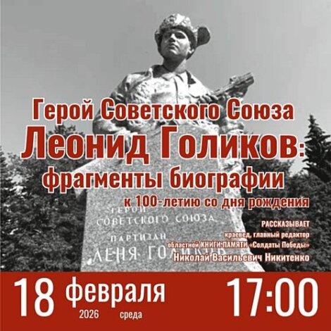 Об этом и многом другом пойдет речь на встрече, посвященной столетию Героя Советского Союза Леонида Голикова. Она состоится 18 февраля в 17:00 в актовом зале библиотеки имени Курбатова.